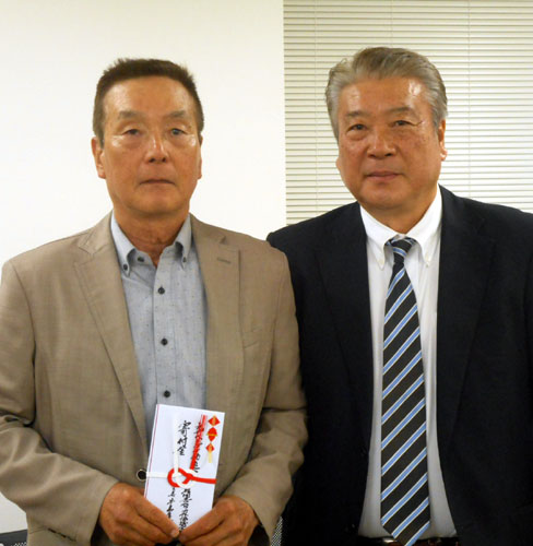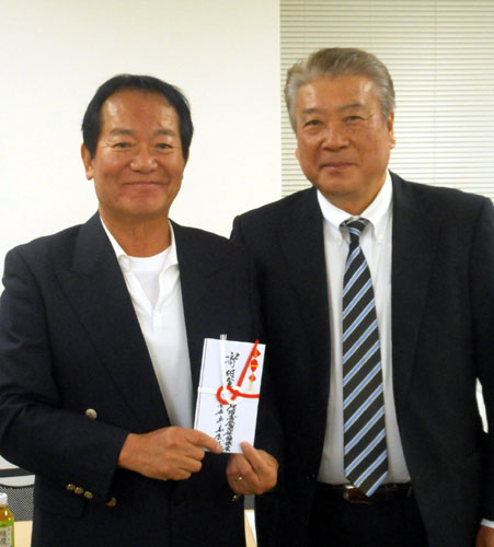 | 牛島会長(中央)と役員 | 株式会社タカミヤより寄付金贈呈 | 博多湾メイタ放流への援助 | |
