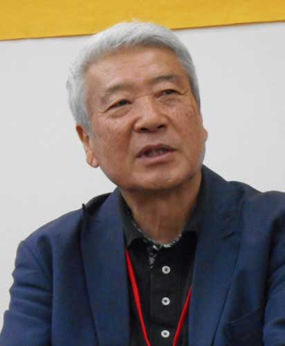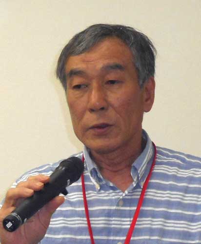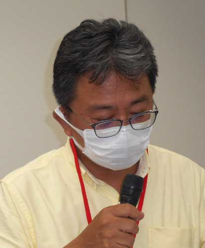 | 質疑応答する牛島会長 | 議事進行は金山総務局長 | 釣大会説明は平井事業部長 | 決算報告は高井経理部長 |